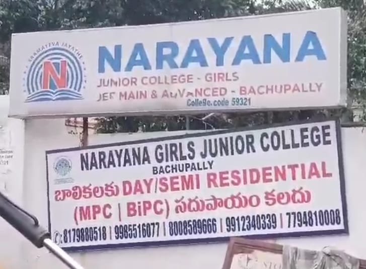 విజయభారతి న్యూస్ ; బాచుపల్లి నారాయణ కాలేజ్ లో అనూష ఫస్ట్ ఇయర్ విద్యార్థిని ఊరి వేసుకొని ఆత్మహత్య చేసుకుంది. దసరా సెలవులకు వెళ్ళిన అనూషనీ ఆదివారం రోజు మధ్యాహ్నం సమయంలో విద్యార్థినీ అనూషను హాస్టల్ లో వదిలి వెళ్ళిన తల్లిదండ్రులు. విద్యార్థిని అనూష