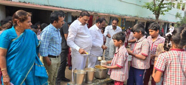 శేరిలింగంపల్లి విజయభారతి న్యూస్ ; శేరిలింగంపల్లి డివిజన్ పరిధిలోని లింగంపల్లి ప్రభుత్వ జిల్లా పరిషత్ ఉన్నత పాఠశాలలో మంగళవారం రోజు కార్పొరేటర్ రాగం నాగేందర్ యాదవ్ తో కలిసి ఆకస్మికంగా తనిఖీ చేసి, మధ్యాహ్నం భోజనం మెనూ ను పరిశీలించి, విద్యార్థులకు మధ్యాహ్నం భోజనం వడ్డించిన పిఎసి చైర్మన్ ఆరెకపూడి గాంధీ. ఈ సందర్భంగా శేరిలింగంపల్లి ఎమ్మెల్యే మరియు పిఎసి చైర్మన్ గాంధీ మాట్లాడుతూ.