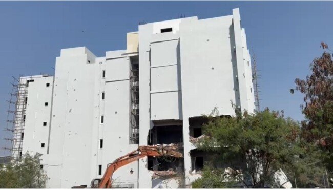 శేరిలింగంపల్లి మాదాపూర్ విజయభారతి న్యూస్ ; అందరికీ వీకెండ్ బ్రేక్ ఉంటుందేమో కాని తమకు మాత్రం 24/7 ఆన్ డ్యూటీ చేస్తాను అంటోంది హైడ్రా. ఇప్పటికే అక్రమ నిర్మాణాలపై ఉక్కుపాదం మోపుతున్న హైడ్రా… మరోసారి అదే స్పీడును కొనసాగిస్తూ మాదాపూర్ డివిజన్ పరిధిలో గల అయ్యప్ప సొసైటీ లో అక్రమ నిర్మాణాల కూల్చివేతలు చేపట్టింది. మాదాపూర్ డివిజన్ పరిధిలో ఉన్న అయ్యప్ప సొసైటీ లో అక్రమ నిర్మాణాల కూల్చివేతలను హైడ్రా అధికారులు కూల్చివేయడానికి రంగం సిద్ధం చేశారు. మాదాపూర్ అయ్యప్ప సొసైటీలో అక్రమంగా నిర్మించిన 5 అంతస్తుల బిల్డింగ్ ను కూల్చేశారు. ఆదివారం రోజు హైడ్రా అధికారులు అయ్యప్ప సొసైటీ వద్దకు పోలీసుల బందోబస్తు భద్రతల అయ్యప్ప సొసైటీలో అక్రమ నిర్మాణాలను కూల్చివేశారు. ఎలాంటి అవాంఛనీయ ఘటనలు జరగకుండా అధికారులు ముందస్తు జాగ్రత్తలు తీసుకుని కూల్చివేతలు ప్రారంభించారు. కూల్చివేస్తున్న భవనం రోడ్డు పక్కనే ఉండటంతో పవర్ సప్లై నిలిపివేసి ఇలాంటి ఘటనలు జరగకుండా కూల్చివేశారు. భవనాన్ని కూలుస్తున్న సమయంలో ట్రాఫిక్ ను పూర్తిగా నిలిపివేయడంతో వాహనదారులు చాలా ఇబ్బందులు ఎదుర్కొన్నారు. రూల్స్ పట్టించుకోకుండా ఉన్న ఏ నిర్మాణాన్నైనా కూల్చేస్తామని హైడ్రా అధికారులు ముందు నుంచీ చెబుతూనే ఉన్నారు. అయినా కూడా కొంతమంది వాటిని పెడ చెవిన పెడుతున్నారు. ఇప్పుడు అయ్యప్ప సొసైటీలో నిర్మించిన భవం కూడా రూల్స్ను అతిక్రమించి కట్టినదే. నిబంధనలకు విరుద్ధంగా సెల్లార్, గ్రౌండ్ తో పాటూ 5 అంతస్తు భవనాన్ని నిర్మిస్తున్నారని అక్కడ స్థానికులు హైడ్రాకు ఫిర్యాదు చేశారు. ఫిర్యాదుల మేరకు ఆ భవనాలను పరిశీలించిన అధికారులు కూల్చివేతలు ప్రారంభించారు.